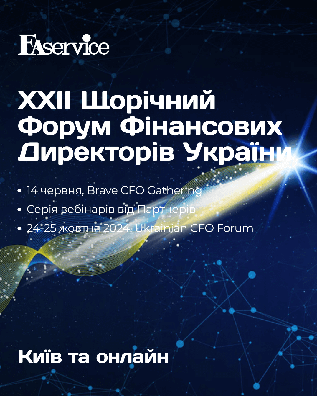 • 24 – 25 жовтня 2024 | Ukrainian CFO Forum – 9 стратегічних сесій, 60+ спікерів з компаній різного масштабу і галузей, від IT до промисловості та банківського сектора. Два насичені дні обговорень, дискусій і спільного пошуку рішень. На порядку денному: Інвестування в економіку України під час воєнного стану, Ефективні стратегії фінансування українського бізнесу, Традиційні та альтернативні інструменти фінансування, Планування, прогнозування та бюджетування, Цифрова трансформація бізнес-процесів, Підвищення прибутковості та фінансової стійкості, Очікування CEO від сучасного CFO, Стратегії стійкого зростання та ESG, Стратегії на основі даних та аналітики, CFO: Еволюція лідерства та бізнес-партнерства.