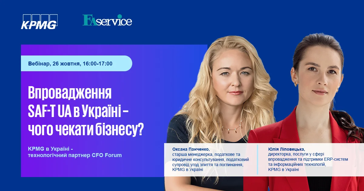 Отже, 26 жовтня, про технічні вимоги та специфікацію SAF-T UA дізнайтесь від Юлії Ліповецької, директорки, послуги у сфері впровадження та підтримки ERP-систем та інформаційних технологій, KPMG в Україні та Оксани Панченко, старшої менеджерки, податкове та юридичне консультування, податковий супровід угод злиття та поглинання, KPMG в Україні.